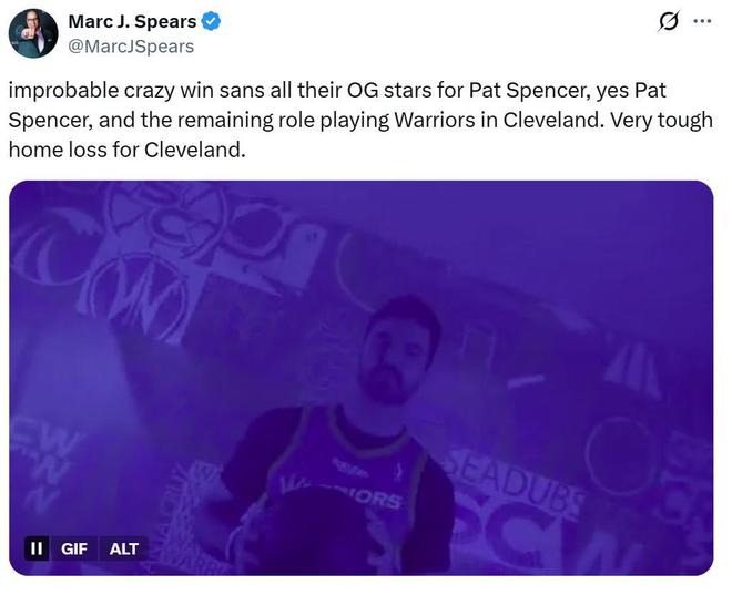 正如名记Marc J. Spears所说,斯宾塞是本场勇士毫无争议的第一功臣,在所有主力老将都未出战的情况下,是他率领一众角色球员从客场送给骑士队一场难以接受的失利。