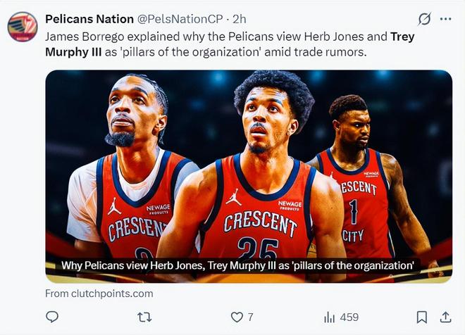 鹈鹕队的赫伯特-琼斯、特雷-墨菲、锡安-威廉森目前都已经陷入交易流言中,琼斯、墨菲两位锋线都是顶级正向资产,鹈鹕队希望从这两人的交易中收回多个首轮签,而锡安的交易价值相对低一些,因为他合同大、伤病隐患大。