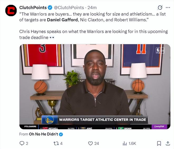北京时间12月20日中午,《雅虎体育》记者克里斯-海恩斯透露,勇士队内部正在积极的讨论补强内线的计划,丹尼尔-加福德、尼克-克拉克斯顿、罗伯特-威廉姆斯这样运动能力出色的中锋是勇士感兴趣的对象。